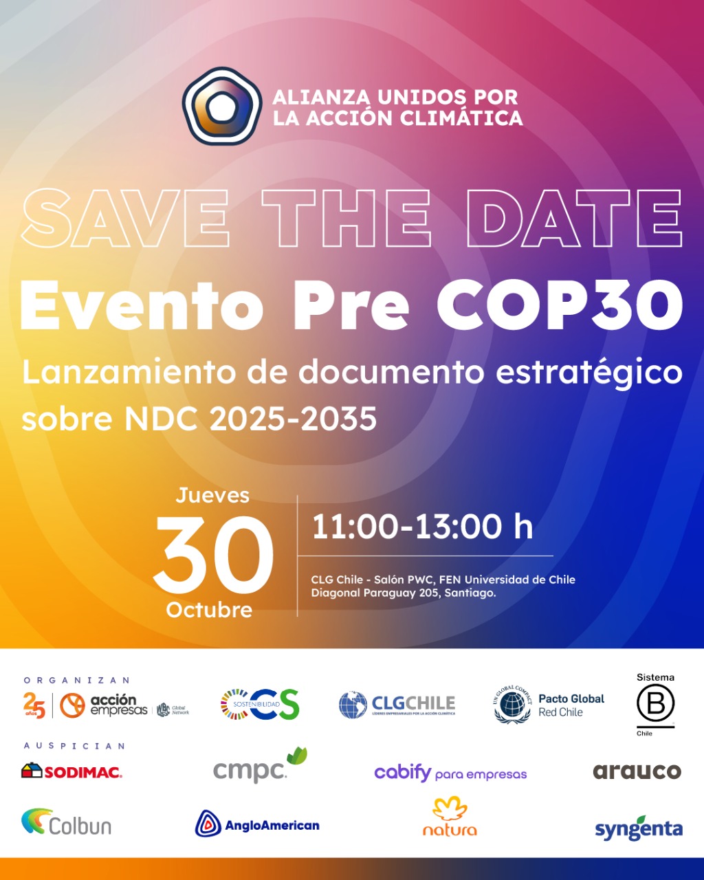 Te invitamos al evento de lanzamiento de nuestro Documento Estratégico sobre la NDC 2025-2035 de Chile para el sector privado. Además, presentaremos las acciones que la Alianza Unidos por la Acción Climática prepara de cara a la COP30 de Brasil.